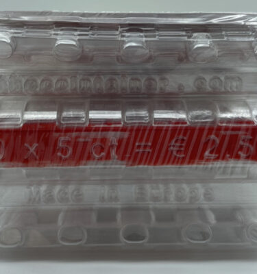 Marquage longitudinal conforme au code couleur européen de conditionnement de la monnaie. Indique la valeur faciale unitaire, le nombre de pièces et la valeur totale contenue dans l’étui.